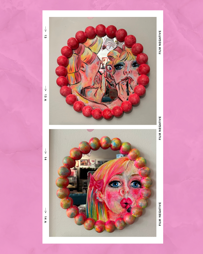 I’ve always been fascinated by mirrors, and their ability to shape our view of ourselves, whether its detrimental, beneficial, or anywhere in between. These two pieces are inspired from images of myself, over a decade apart- Two completely different places in life, and yet so similar. Pink lipstick and big eyelashes are some of my favourite elements of glamour and power-both main focuses of these pieces. When I put these on, it feels like a transformation into a part of myself that I dreamt of for most of my life.