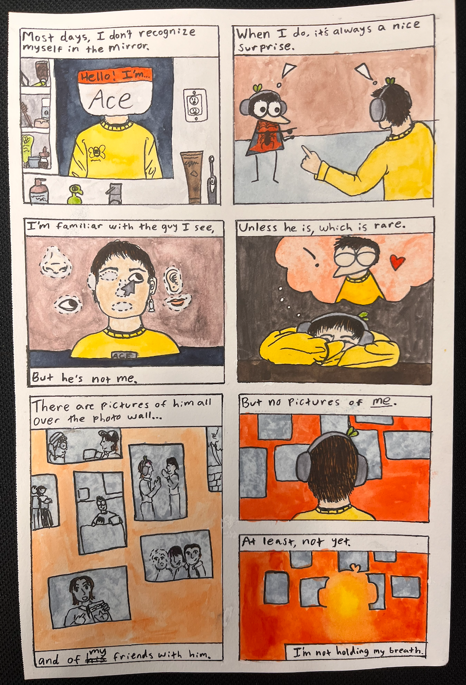 Despite Everything is a comic page I drew in response to the odd sensation of not recognizing yourself in the mirror. The comic was done in one day, and is a bit of a rush job, but I wanted to express how I felt and only using words wasn't doing the trick anymore. I've drawn many of these one-page comics, and they function a bit like diary entries, leaving an imprint of how I felt at a specific time.