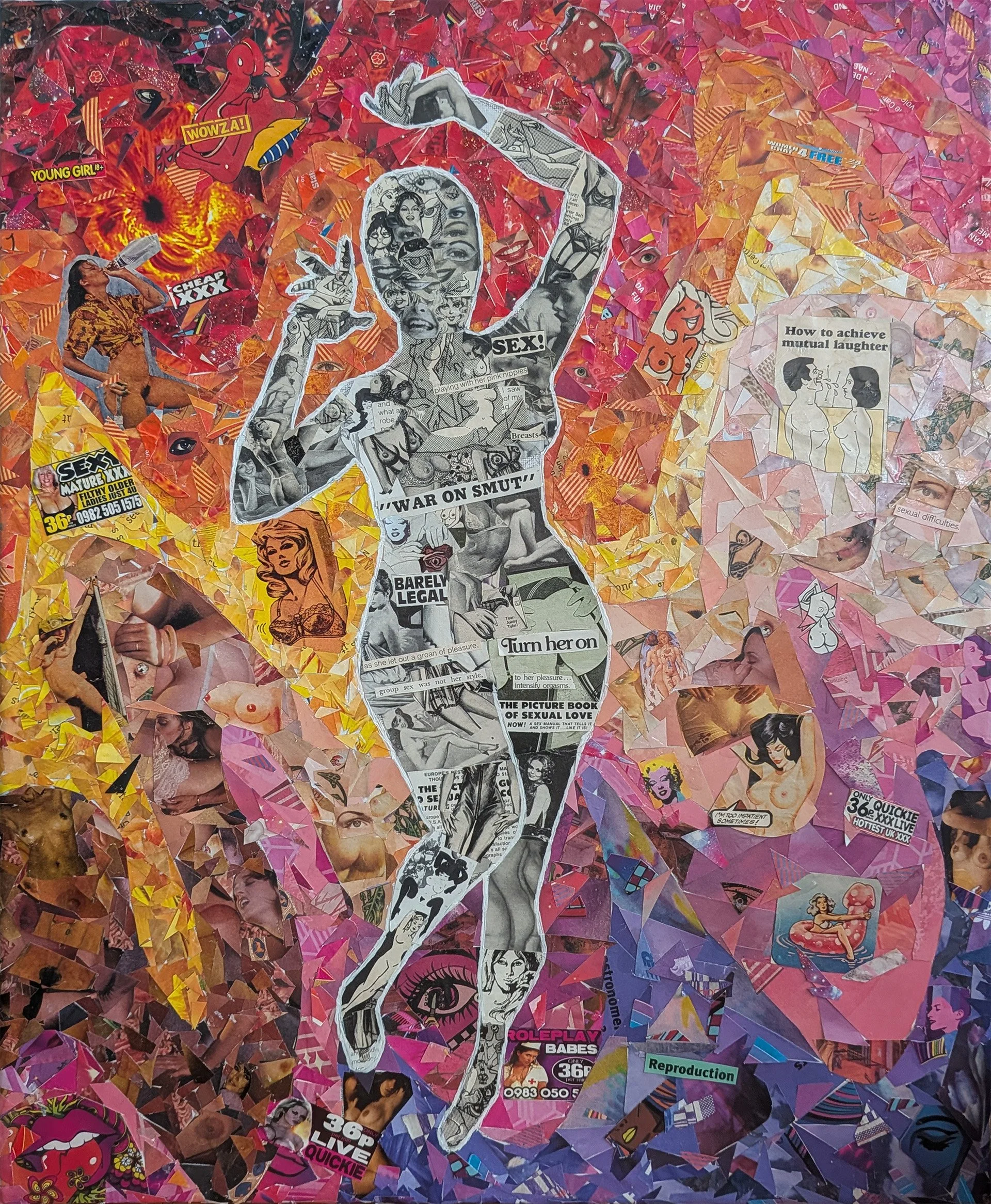 As a queer non-binary person, I both see myself within this piece and without it - a person who participates in objectification, and has been objectified myself. How it can be both a space to have fun and enjoy the experience in safe, queer spaces, and also a place of isolation and overwhelm as I navigate what I like to see within my identity, and what I enjoy in others, and what is forced upon me. This piece reflects on feminine sexuality and its impact on self-perception. Using cutouts from decades of printed media, it captures the broad spectrum of how femininity and sexuality have been represented and consumed. Through the eyes of others, the feminine body has been both exploited and celebrated throughout history, with depictions of the “ideal woman” shaping how we come to see ourselves as we peer into an endless void of sexual content.